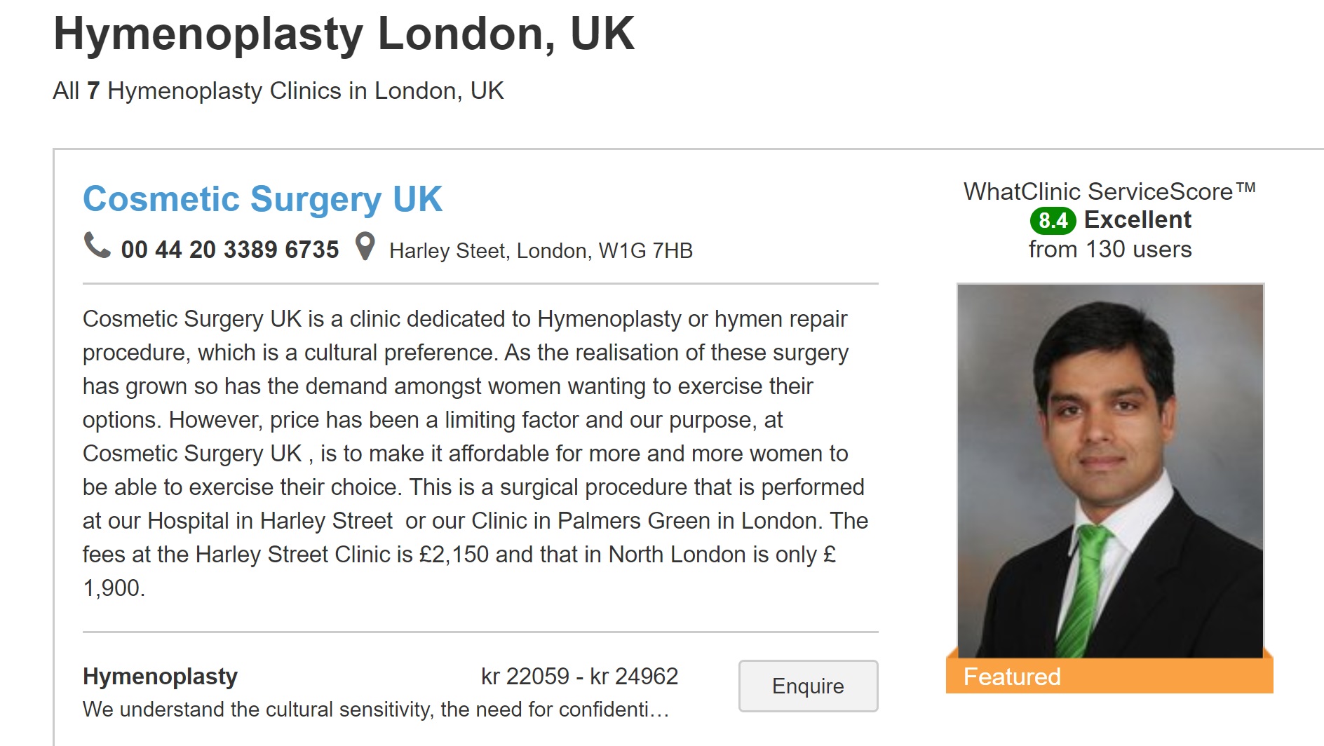 Muslimske jenter som føler at de må bevise sin uskyld på bryllupsnatten går til kirurgen for å få hjelp til å lage ny jomfrudom. I London er dette big business. Et googlesøk viser at syv klinikker spesialiserer seg på såkalt hymenoplasty, men det er minst 22 klinikker totalt som tilbyr dette, ifølge The Times.