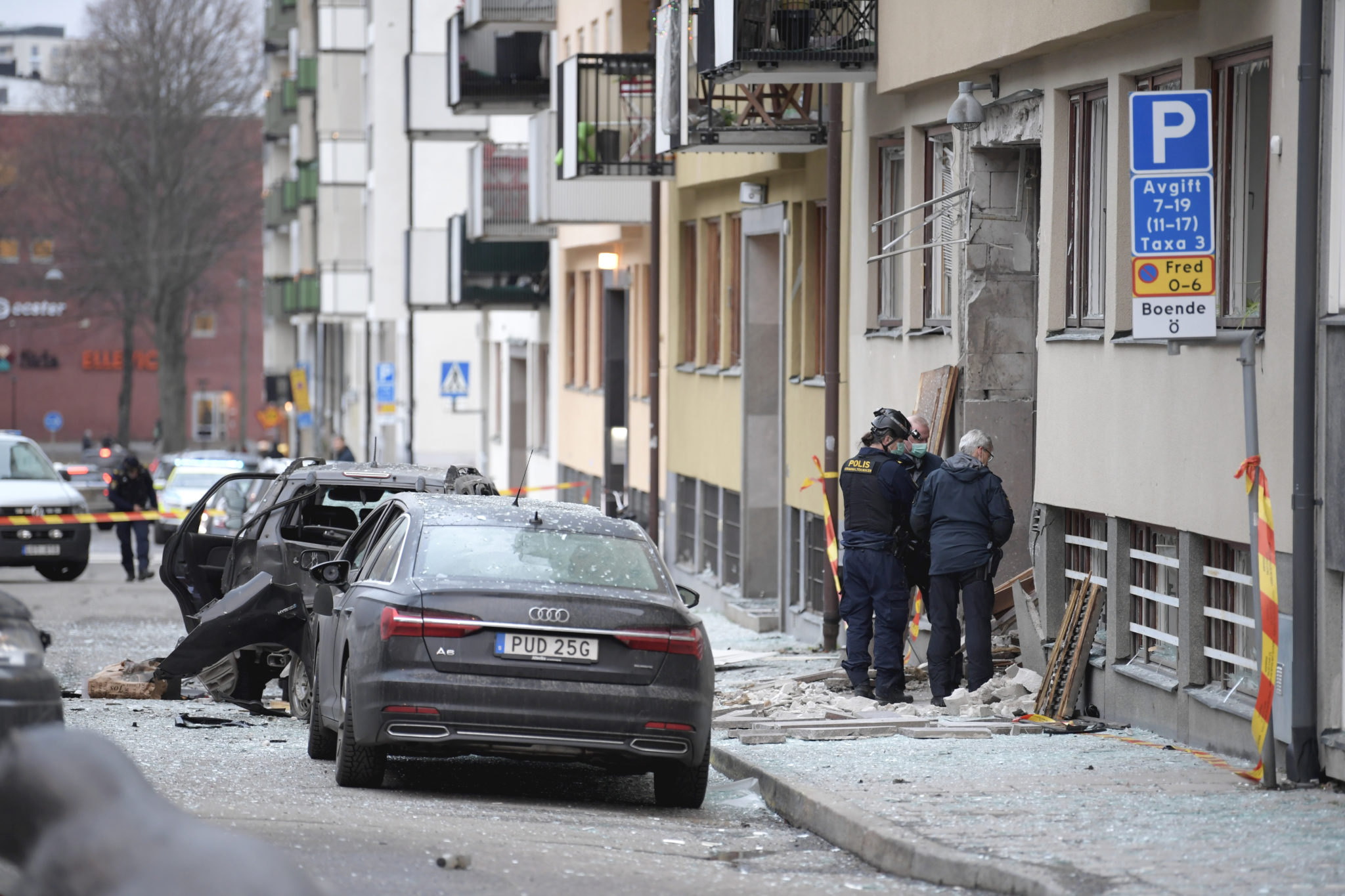Poliser undersöker området vid ett flerfamiljshus på Gyllenstiernsgatan på Östermalm i Stockholm har fått omfattande skador vid en kraftig explosion, natt til den 13. januar, 2019. Foto: Janerik Henriksson/TT / NTB Scanpix
