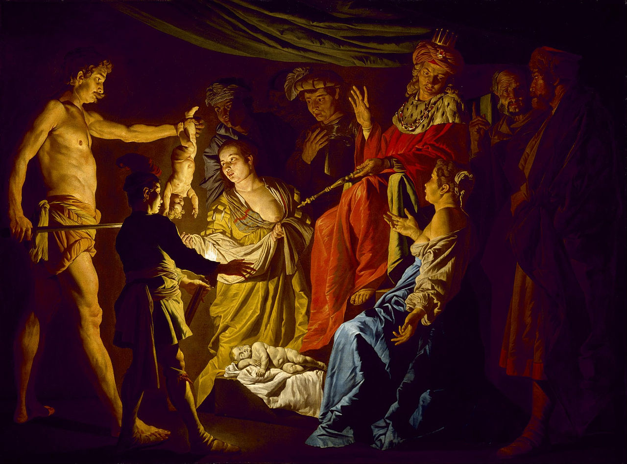 Matthias Stomer (ca. 1600 – ca. 1650), «Salomon dømmer» (ca. 1640). Museum of Fine Arts, Houston. Etter 1. Kongebok, 3: 16–28. To kvinner påstod begge at de var moren til et guttebarn. Kong Salomon gav barnet til henne som heller ville gi det til den andre enn at barnet ble hugget i to for å gi en halvpart til hver av kvinnene.