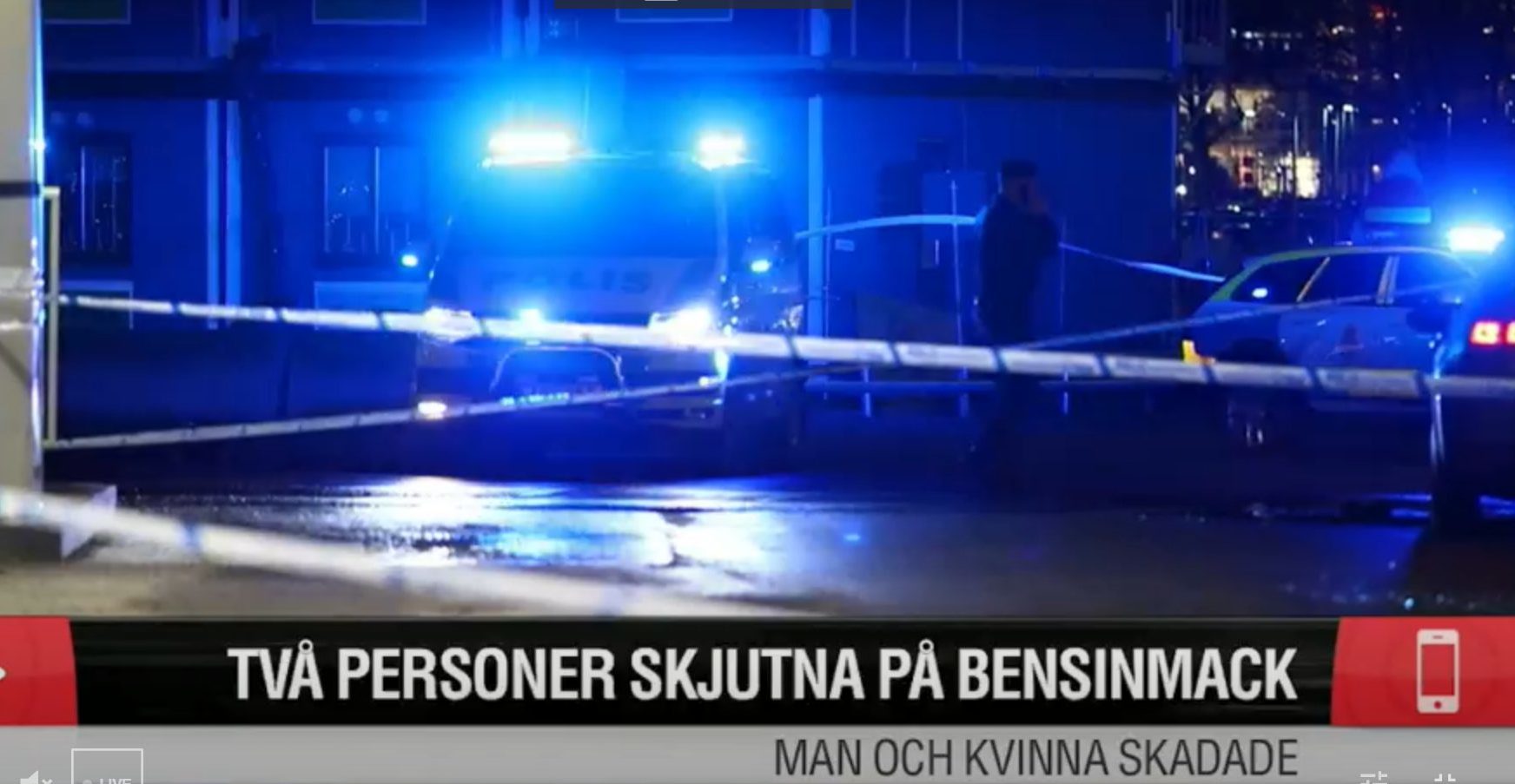 En mann og en kvinne er skutt på en bensinstasjon i Stockholm. De to satt i en bil da de ble skutt. Mannen skal være skutt i hodet.