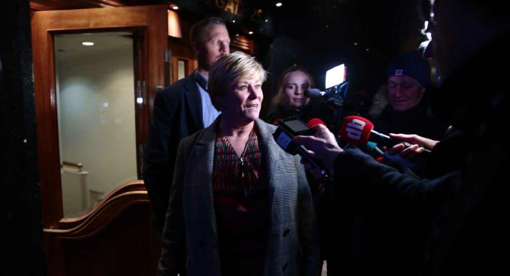 Frp-leder Siv Jensen på vei ut etter møte med partiledelsen for å ferdigstille kravene til statsminister Erna Solberg søndag. Ifølge NRK blir det ekstraordinært landsstyremøte i Frp mandag. Foto: Håkon Mosvold Larsen / NTB scanpix