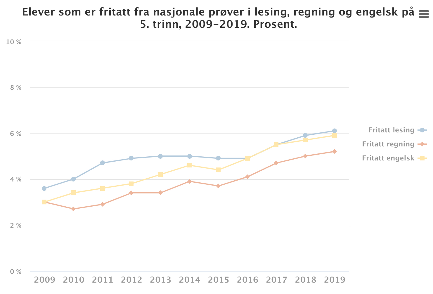 Som figuren fra rapporten viser, var det i 2009 kun ca. 3 % av elevene som fikk fritak fra nasjonale prøver i regning og engelsk. Dette tallet har nå steget til henholdsvis 5 % og 6 %. I lesing er tallene henholdsvis ca. 3,5 % og 6 % for samme tidsrom.