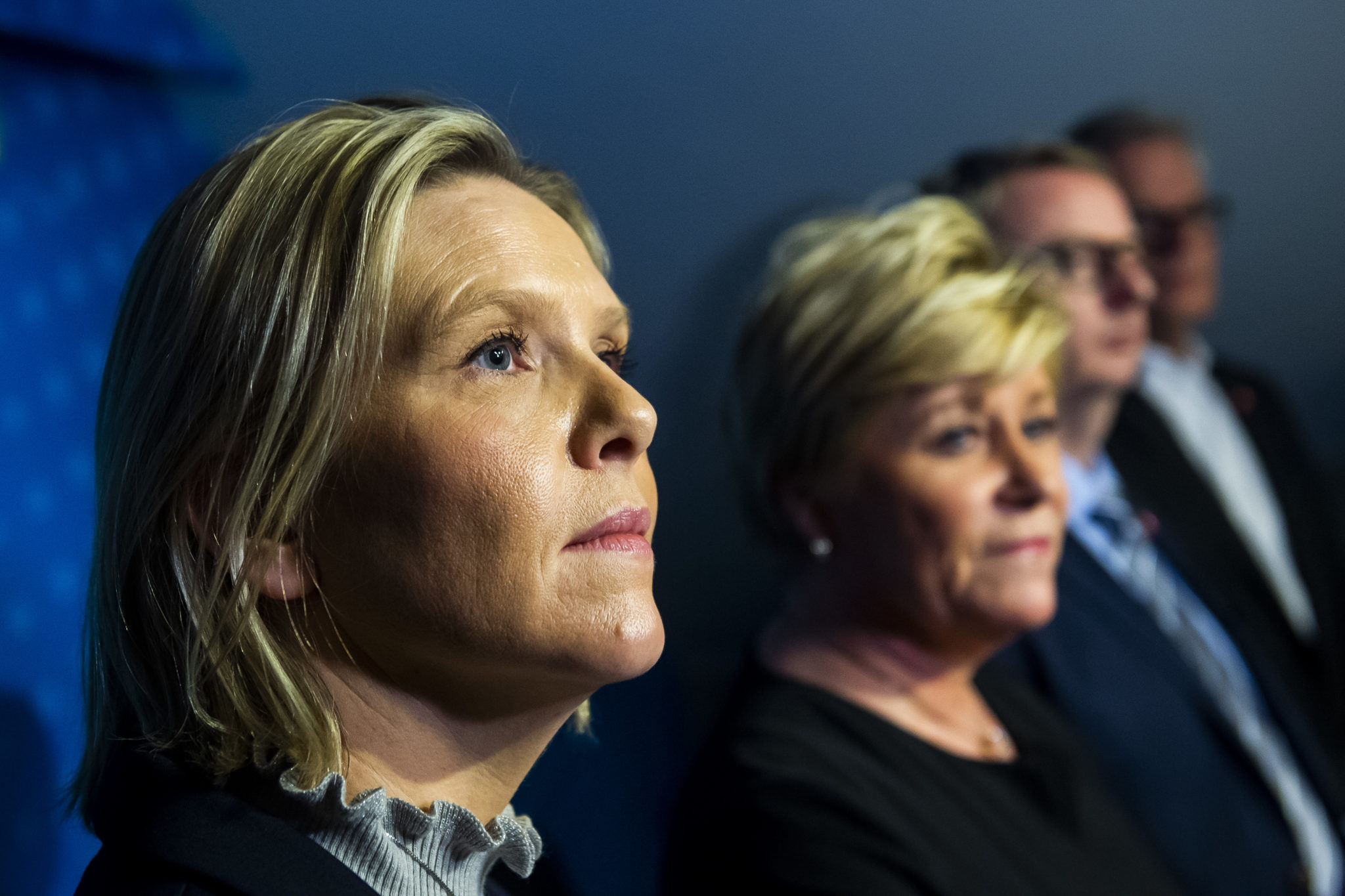 Sylvi Listhaug, Siv Jensen, Terje Søviknes og Hans Andreas Limi kunngjør at Frp går ut av regjeringen den 20. januar 2020. Foto: Fredrik Varfjell / NTB scanpix.