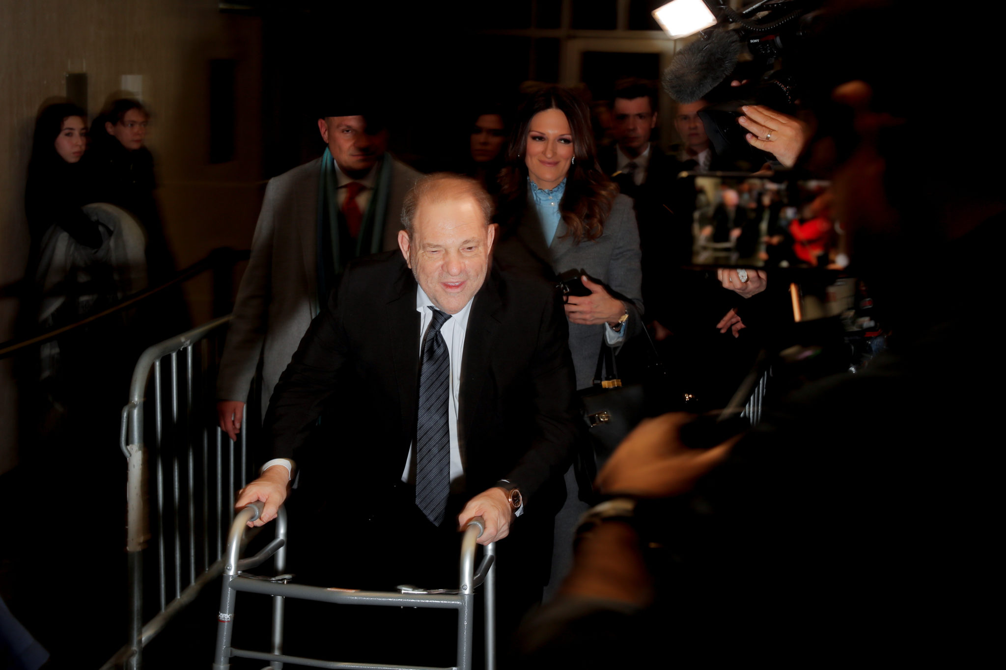 Harvey Weinsten er en redusert mann, på alle måter. Gåstolen skal skyldes en ryggoperasjon. Men han er ellers bare en skygge av seg selv. Her forlater han rettssalen på Manhatten onsdag. Bak ham går hans advokat, Donna Rutino. Foto: Lucas Jackson/Reuters/Scanpix