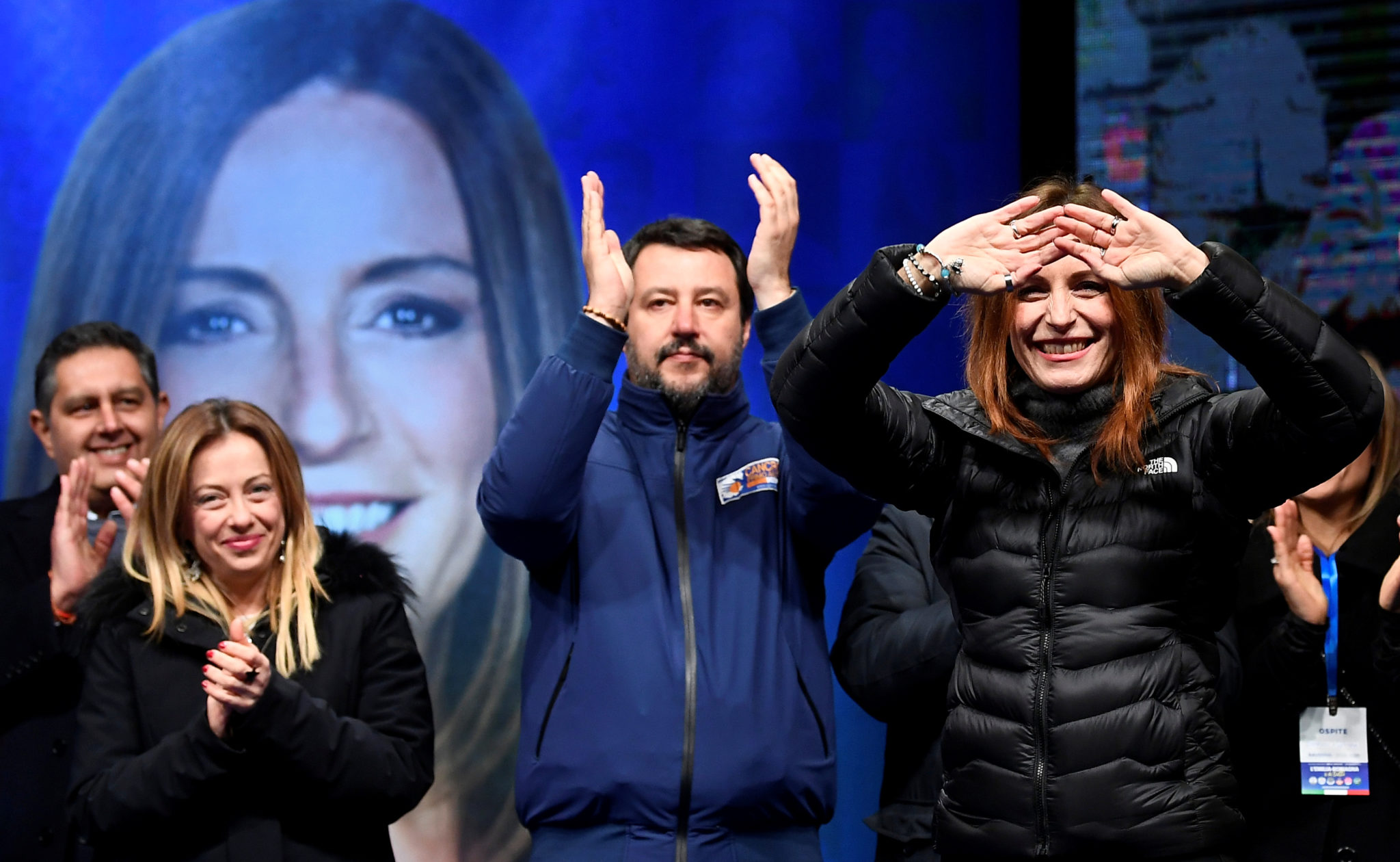 Høyresidens toppkandidat ved regionvalget i Emilia-Romagna, Lucia Borgonzoni (t.h.) figurerer sammen med sin partileder Matteo Salvini og lederen for det allierte partiet Fratelli d’Italia, Giorgia Meloni, under et valgkamparrangement i Ravenna den 24. januar 2020. Foto: Flavio Lo Scalzo / Reuters / Scanpix.