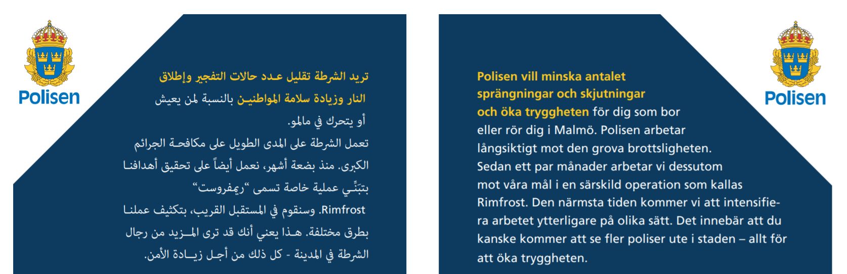 I pressemeldingen fra det svenske politiet fremgår det at politiet også vil forsøke å spre sitt viktige budskap til befolkningen med flygeblad og økt tilstedeværelse i Malmøs gater.