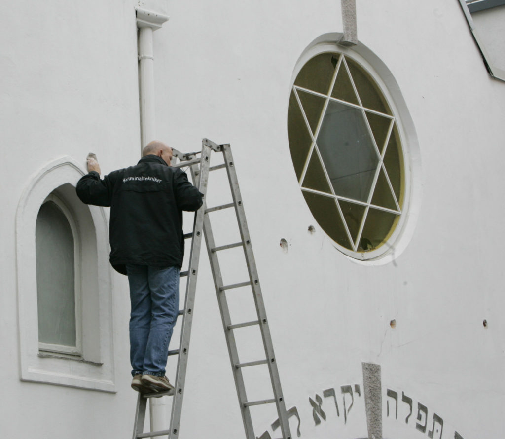 OSLO 18.09.2006: Politiets åstedsgranskere var mandag i full aktivitet med å undersøke ytterveggen på synagogen i Bergstien i Oslo etter skuddene natt til søndag. Foto: Morten Holm / SCANPIX.