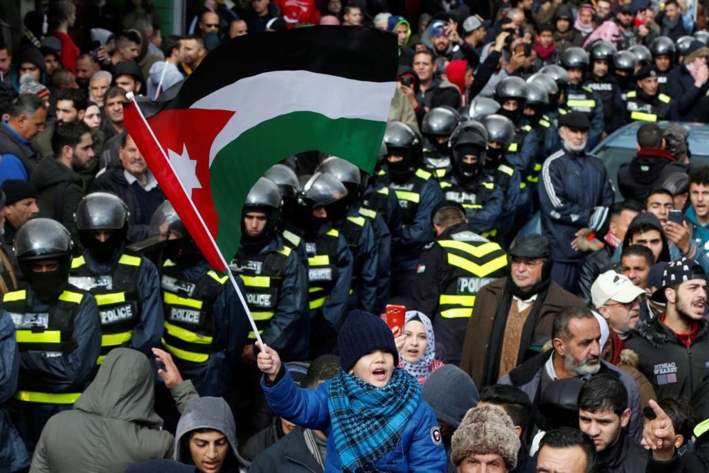Det høres nesten ut som om UNRWA ønsker seg en voldelig reaksjon. Demonstrasjonen er fra Amman. 60 prosent av befolkningen er palestinere. De har levd i villfarelsen om å vende tilbake. Hvem har latt dem gjøre det? Foto: Muhammad Hamed/Reuters/Scanpix