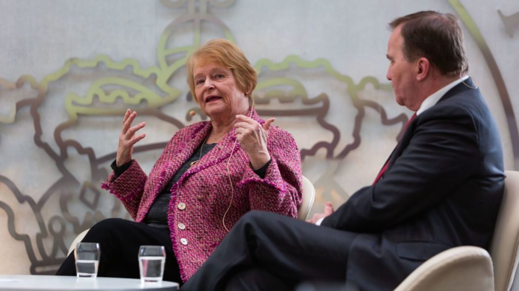 Gro Harlem Brundtland i kjent, belærende positur. Her er det Sveriges statsminister, Stefan Löfven, som lytter til hva Norges første kvinnelige miljøvernminister har å si sine nordiske partifeller. Bildet ble tatt på årsmøtet for Samarbeidskomitéen for de nordiske sosialdemokratiske partiene og landsorganisasjonene (SAMAK), 29. januar 2020 i København. Foto: Socialdemokratiet.dk