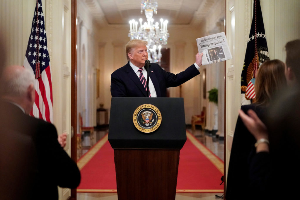 Presidenten holdt fram forsiden av torsdagens Washington Post hvor det står «Trump acquitted» (Trump frikjent) med fete typer – til applaus fra salen.