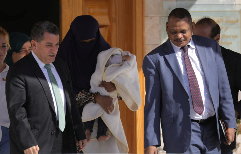 Abdulkarim Omar, utenrikssjef for selvstyremyndighetene i det nordøstlige Syria, eskorterer en sudanesisk IS-kvinne som returnerte til Sudan etter deltakelse i IS-kalifatet. Foto: Reuters/Rodi Said/NTB scanpix