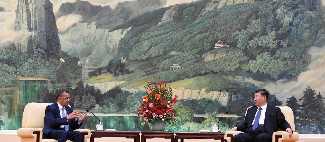 Tedros Adhanom, leder av World Health Organization, møter president Xi jinping 28, januar 2020. Da ble det lovet at en WHO-delegasjon skulle komme for å kartlegge forholdene. Men den har ennå ikke kommet av gårde. Foto: Naohiko Hatta/Reuters/Scanpix