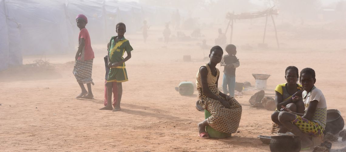 Internt fordrevne for jihadistenes vold i Roffenega, sitter i en støvsky i en leir bygget av en tysk NGO i Pissila, Burkina Faso 24. januar 2020. Foto: Anne Mimault/Reuters/Scanpix