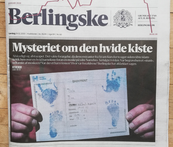 Fredag den 14. februar råbte Stram Kurs-demonstranter provokerende budskaber hen over en lille barnekiste, der lå synlig i en rustvogn foran moskeen på Dortheavej i København. Politikere på tværs af partier har raset over episoden, som statsministeren har kaldt »mangel på empati«. Mens andre med stigende kraft rejste tvivl om, hvorvidt hele hændelsen var iscenesat, muslimsk propaganda. Findes det døde barn? Og hvor var forældrene? Her er den fulde historie om demonstrationen på Dortheavej.