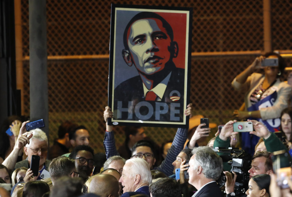 Joe Biden beveger seg blant mengden på valgmøtet i Los Angeles, der en tilhenger holder opp bildet av Obama. Men Obama har ikke offentlig støttet Biden og hans taushet er talende. Obama tror ikke Biden er mannen. Foto:Mike Blake/Reuters/Scanpix