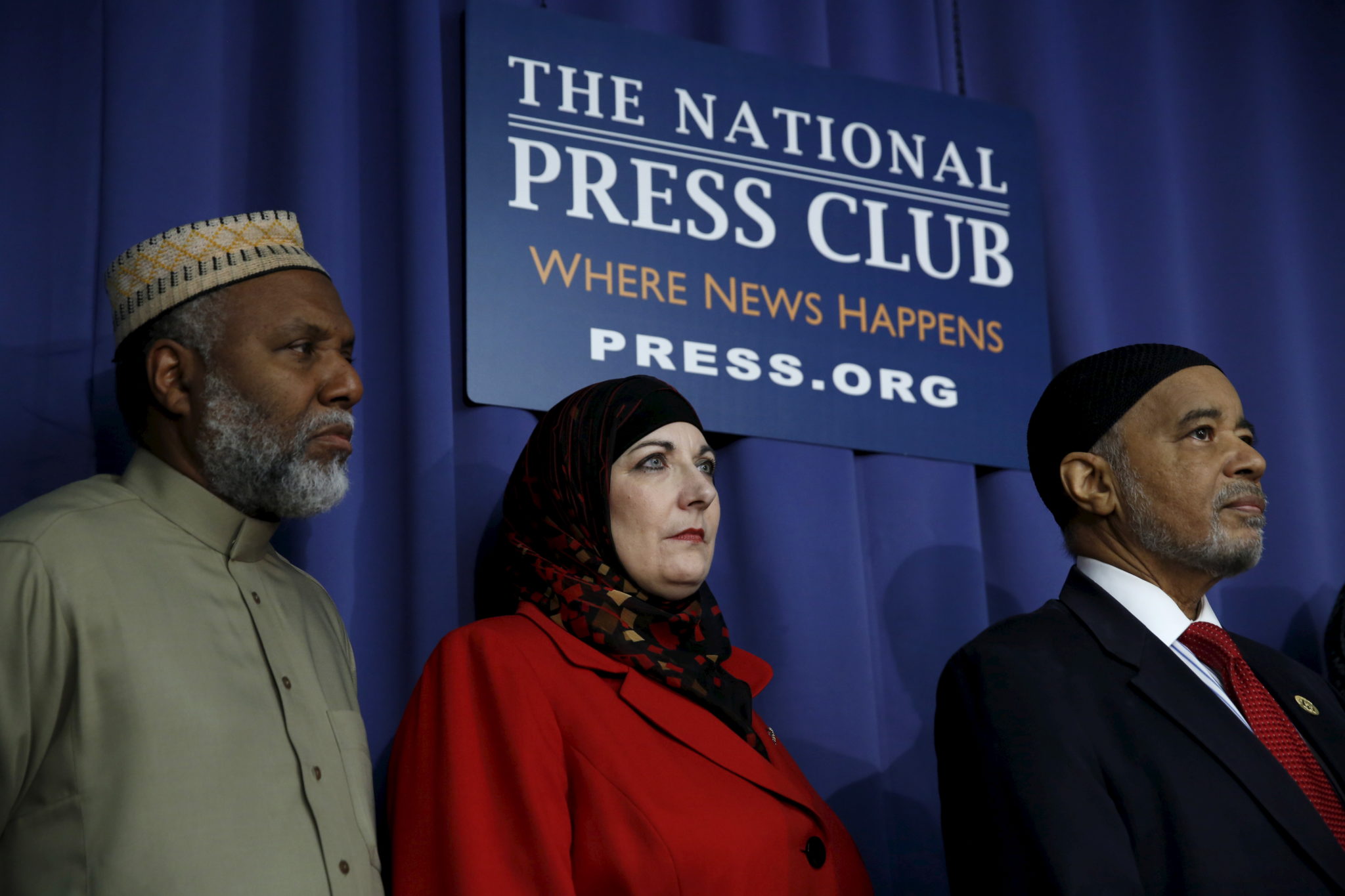 Islamistiske Council of American-Islamic Relations, CAIR, diskuterer «økende islamofobi» i Washington, 21. desember 2015. Fra venstre: Imam Johari Abdul-Malik fra Council of Muslim Organizations, Kristin Szremski fra American Muslims for Palestine og imam Mahadi Bray fra American Muslim Alliance. Foto: Kevin Lamarque/Reuters/Scanpix