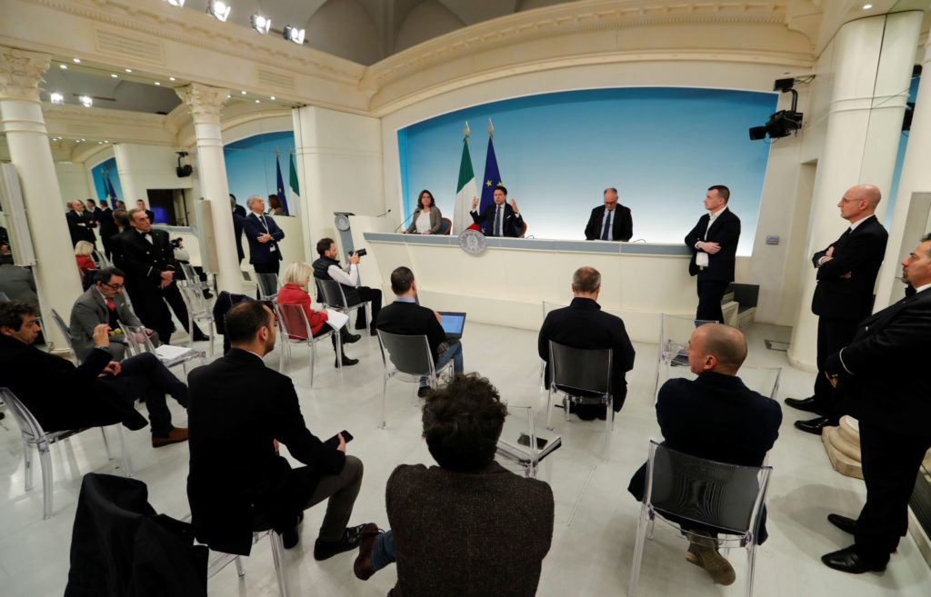 Statsminister Giuseppe Conte holder pressekonferanse i Palazzo Chigi onsdag. Journalistene sitter med en meters avstand. Foto: Remo Casilli / Reuters / Scanpix