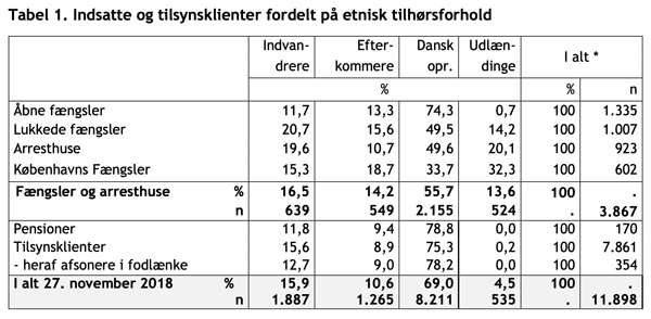 Berlingske har set nærmere på Kriminalforsorgens rapport ‘Etnicitet og statsborgerskab 2018’, der fortæller at 50,5 procent af de 1.007 indsatte i landets lukkede fængsler var udlændinge, indvandrere eller efterkommere. For Københavns vedkommende var det 66,3 procent af ud af 602 indsatte. Fra B.dk – Stadig flere indsatte i landets fængsler og arresthuse har udenlandsk baggrund.