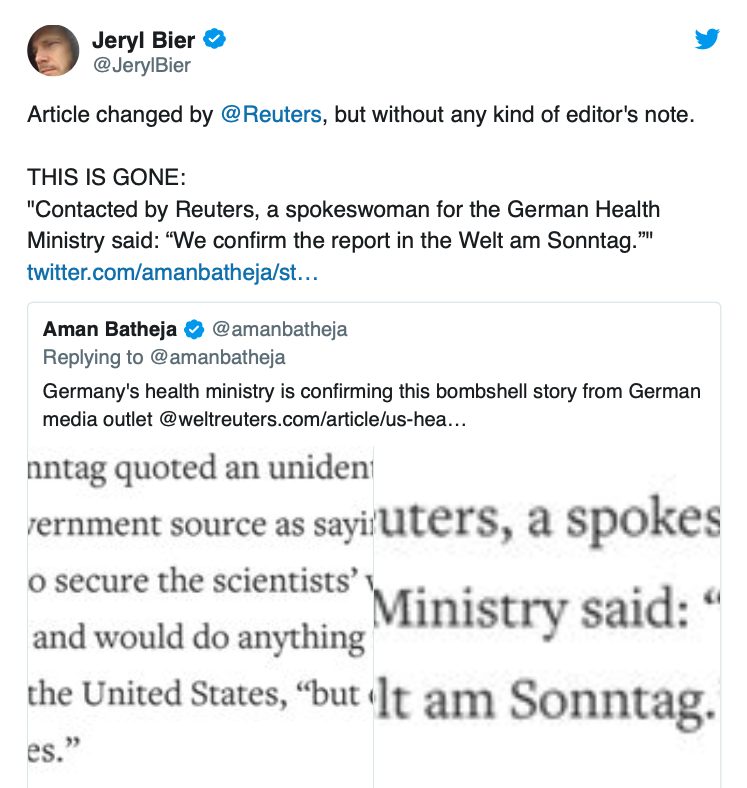 Da storyen ikke lot seg bekrefte og CureVac benektet kategorisk at den var sann, endret Reuters sin story, men uten å gjøre oppmerksom på at den første versjonen var løgn.