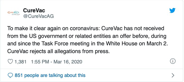 But the story quickly fell apart. CureVac issued a statement on Twitter denying that it received an offer from the U.S. government. “CureVac rejects all allegations from press,” the firm said.
