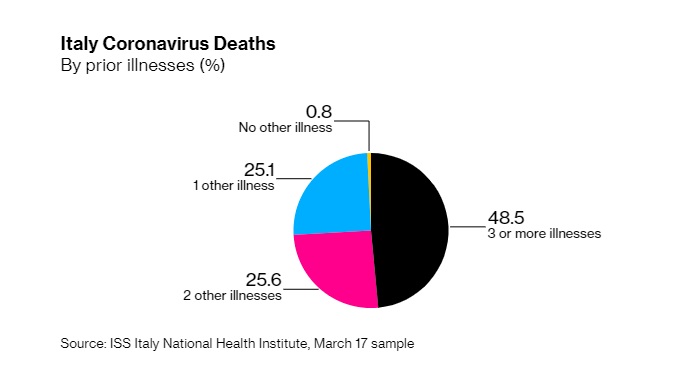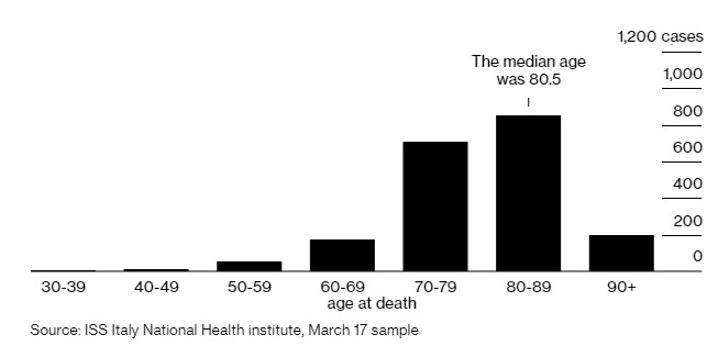 Gjennomsnittsalderen på de avdøde var på 79,5 år. Per 17. mars hadde 17 personer under 50 år dødd av viruset. Alle Italias avdøde under 40 år var menn med eksisterende alvorlige diagnoser.