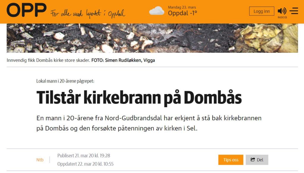 Ifølge avisen Gudbrandsdølen Dagningen er mannen som er siktet for å satt fyr på Dombås kirke, en «lokal ung mann». NRK fastslo lørdag kveld at han var «fra området».