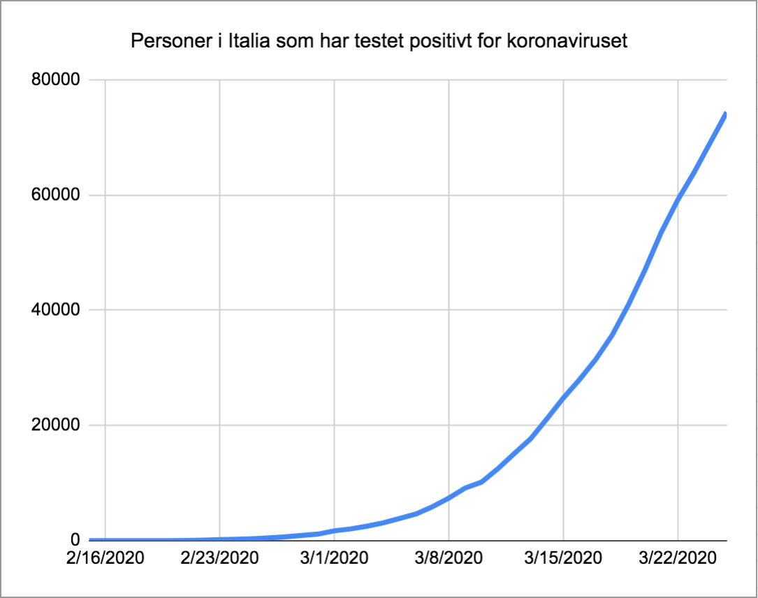 5210 nye personer har testet positivt for koronaviruset i Italia det siste døgnet (+7,5 % mot +8,2 % i går), hvor det er foretatt 27.481 tester. Antallet påviste smittetilfeller siden epidemien starten har dermed nådd 74.396. Det er nå i alt 7503 virusdøde, kunngjør det italienske sivilforsvaret.
