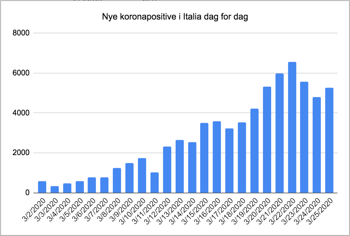 Antallet som tester positivt dag for dag, kan se ut til å være i en langsomt nedadgående trend, etter å ha nådd en topp, som forhåpentligvis ikke overstiges, den 22. mars.