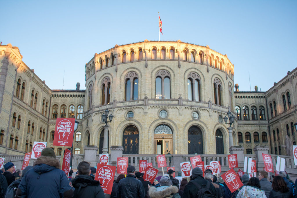 Demonstrasjon mot norsk medlemskap i EUs energiunion foran Stortinget den 19. mars 2018. Foto: Nei til EU / Flickr