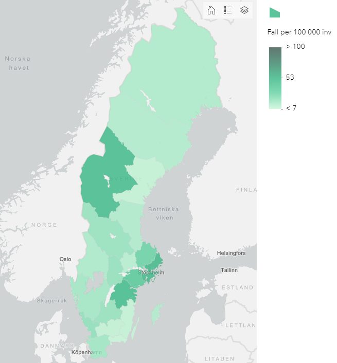 Jämtland Härjedalen med sine populære skiferiesteder har mange smittede i forhold til innbyggertallet, men så langt ingen dødsfall.