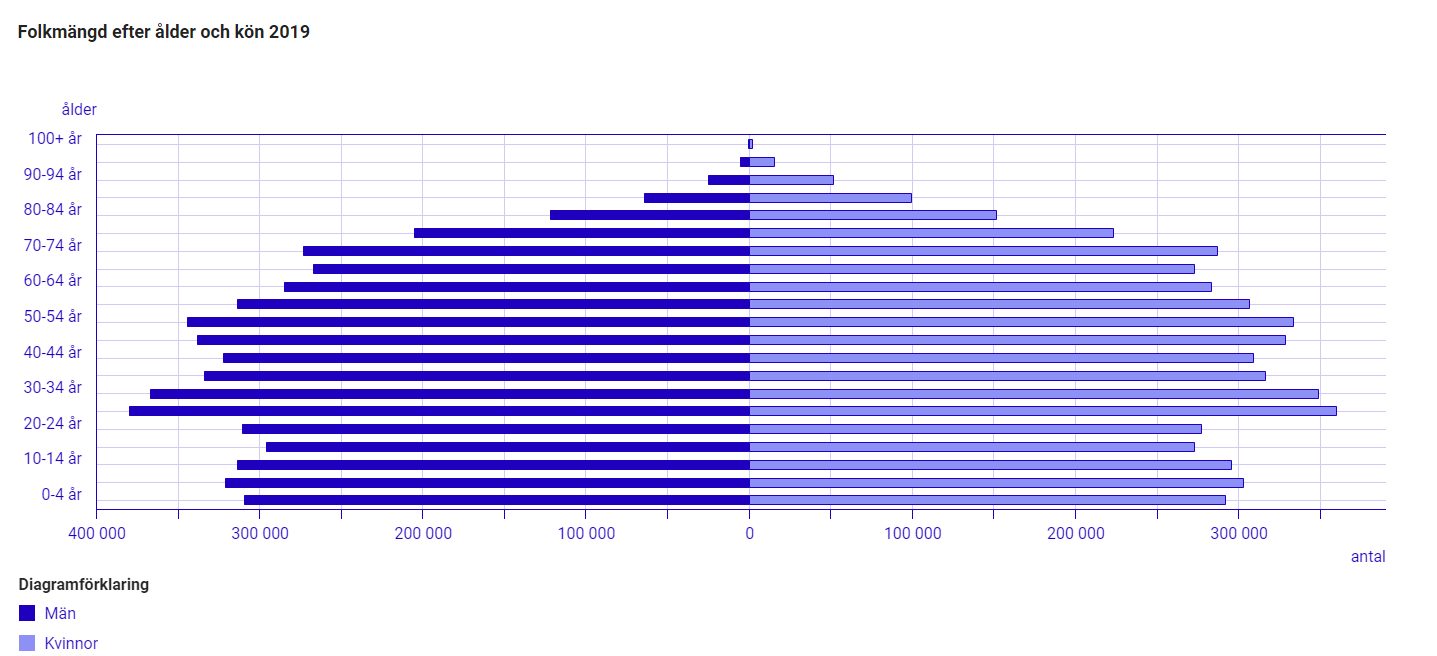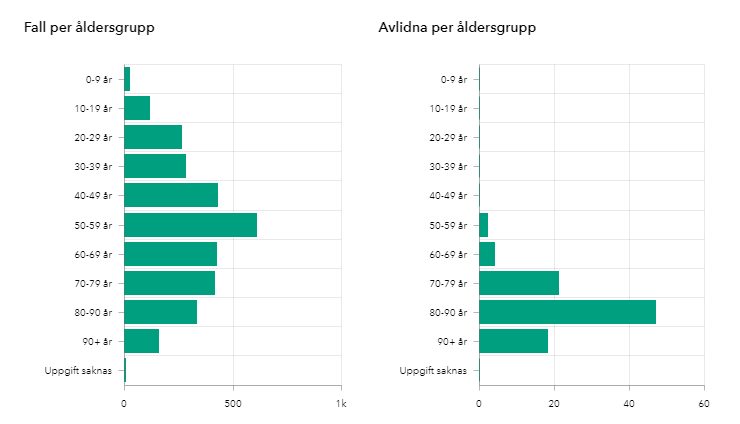 Aldersmessig så fordeler Sveriges befolkning seg som vist i grafen nedenunder De eldste aldergruppene utgjør en mindre del av befolkningen, men er de som har størst risiko for å dø av viruset. Det antas at mange unge er smittet, men at disse ikke er blitt testet, eller er symptomfrie.