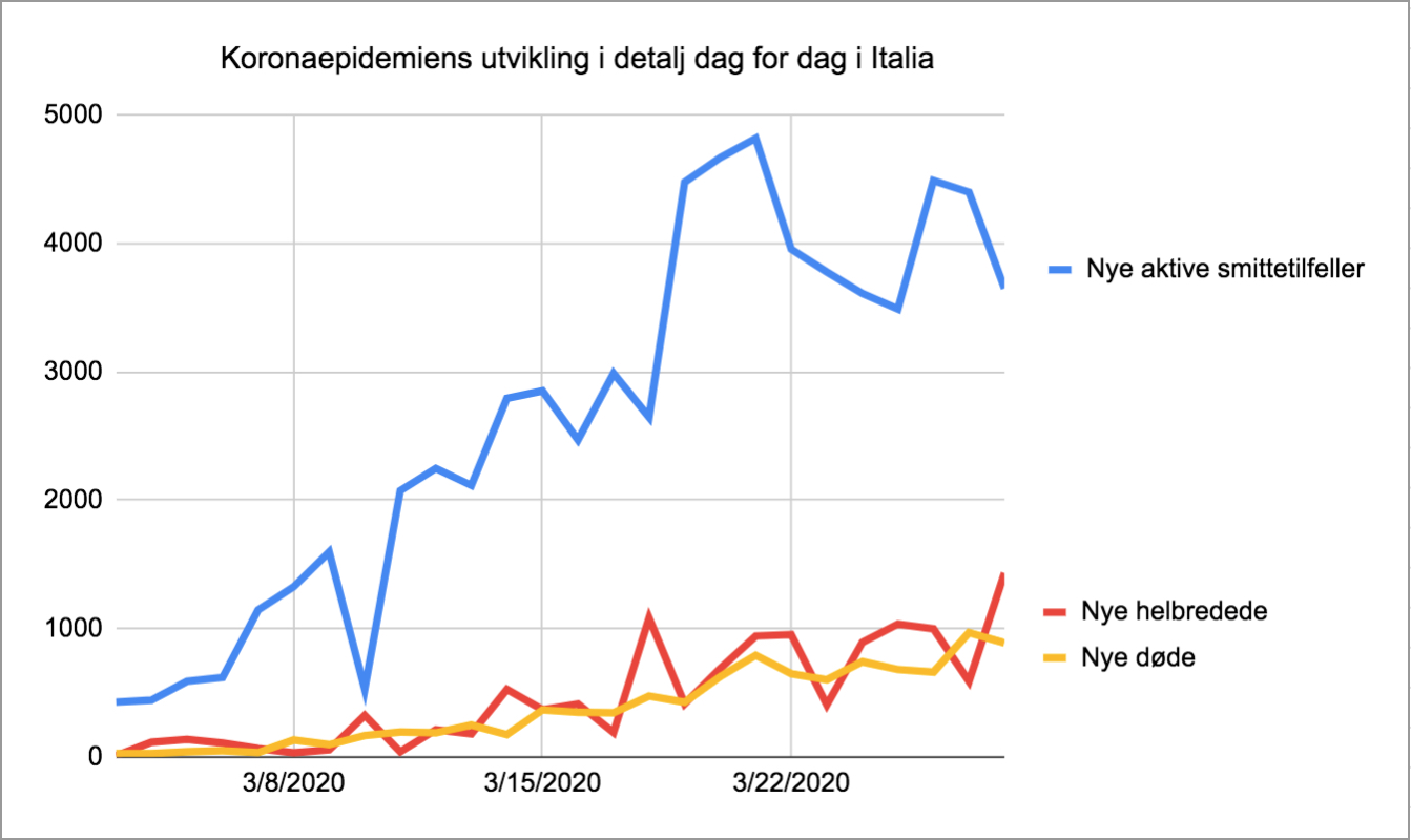 Antallet nye aktive smittetilfeller pr. dag nærmet seg 5000 den 21. mars, men er nå nede i 3650. Den blå kurven svinger nokså vilt etter toppunktet forrige lørdag, men italienske epidemiologer forklarer at det skyldes forsinkelser i registreringen, slik at svingingene med punktligere registrering ville ha vært mer dempet, for slik å utgjøre støy på en svakt avtagende trend som i virkeligheten er noe klarere.