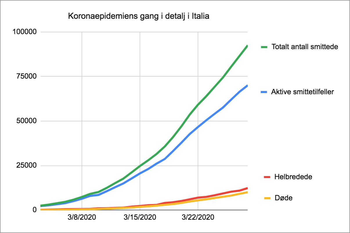 Idet antallet døde i koronaepidemien overstiger 10.000 i Italia, 889 flere siste døgn, og antallet personer som har testet positivt siden starten, nærmer seg 100.000, er det kanskje på tide å gå litt mer detaljert inn i tallene fra Italias helsedepartement, som sivilforsvaret kunngjør oppdateringer av hver ettermiddag.