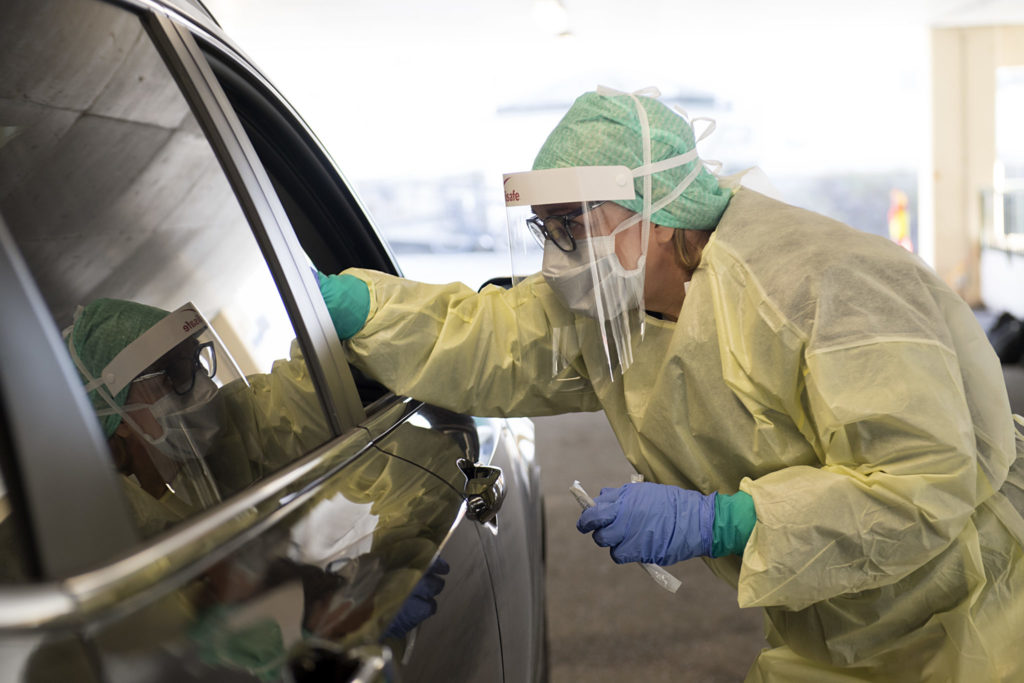 Ansatte blir testet for koronavirus når de kommer kjørende til Haukeland universitetssykehus. Foto: Marit Hommedal / NTB scanpix