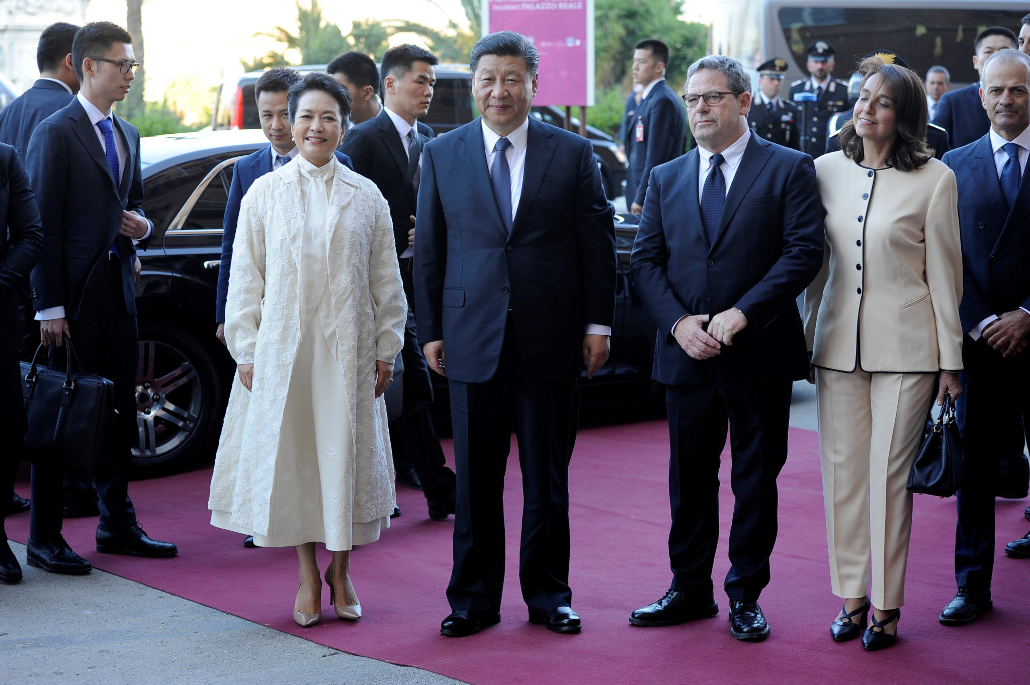 President Xi Jinping og kona Peng Liyuan var 22. og 23. mars i fjor på besøk i Roma og Palermo. De ble mottatt som om Xi er keiser. Her mottas de ved ankomsten til Palermo av presidenten for delstatsforsamlingen på Sicilia, Gianfranco Micciche. Foto: Guglielmo Mangiapane/Reuters/Scanpix