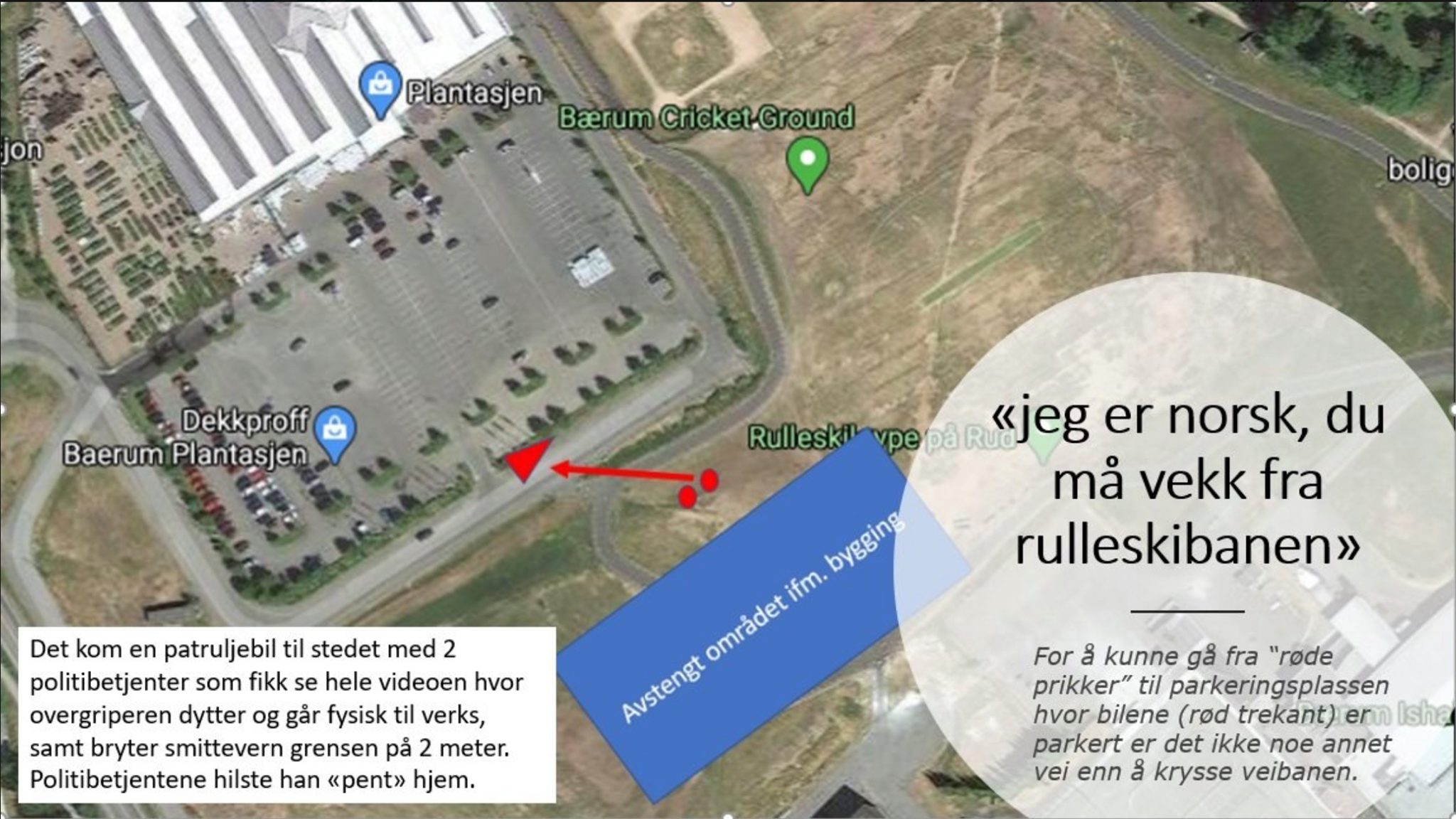 Under hele samtalen opplevde jeg denne mannen aksepterte ikke vår tilstedeværelse på stedet. Jeg oppfattet at han flere ganger påstod å være mer norsk enn meg og han hadde mer rett til å bruke og være der. Han spurte meg blant annet «hvilket land er du ifra?», «Jeg er norsk», «du må vekk fra rulleskibanen».