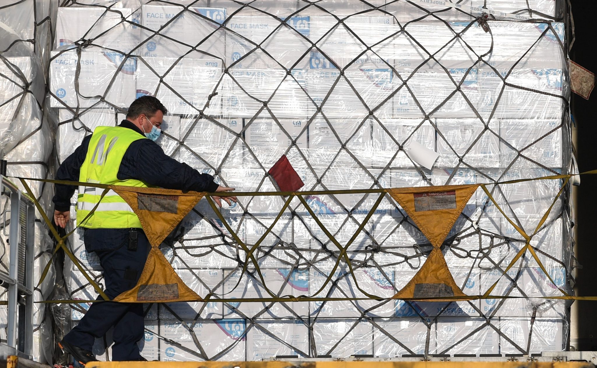 En ansatt ved flyplassen i München åpner lasterommet på et Lufthansa-transportfly som har fraktet 8 millioner ansiktsmasker fra Shanghai den 7. april 2020. Illustrasjonsfoto: Andreas Gebert / Reuters / Scanpix.