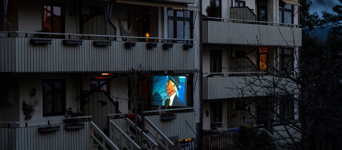 Flere kommuner ber myndighetene vurdere om personer i risikogruppene i større grad bør ta belastningen med å isolere seg framfor strenge allmenne tiltak. Her sees Olsenbanden på storskjerm på balkongen i en boligblokk i Oslo under koronapandemien. Foto: Cornelius Poppe / NTB Scanpix