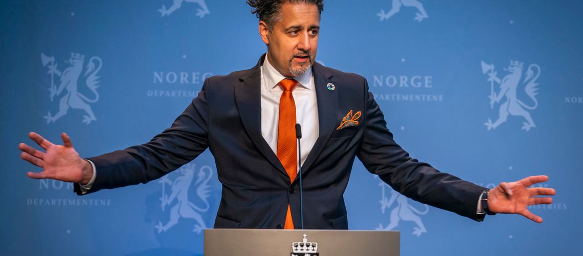 Kultur-Norge ledes nå av Venstres Abid Raja. Å være kulturminister betyr i våre dager å sitte på en stor pengesekk. Alle vil derfor være venner med deg. Her forklarer Raja at korpsene kan få spille 17. mai, bare de holder to meters avstand. Foto: Heiko Junge/Scanpix