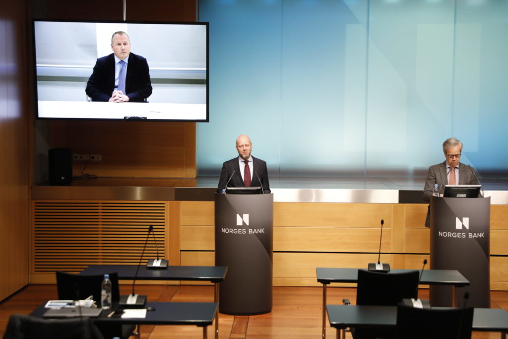 Bakgrunnssjekken Norges Bank gjorde av påtroppende sjef i oljefondet Nicolai Tangen (på storskjerm til venstre) var ikke veldig grundig, skriver Dagens Næringsliv. 26. mars ble han presentert som ny sjef for oljefondet av sentralbanksjef Øystein Olsen (t.h.) og avtroppende leder Yngve Slyngstad. Foto: Ole Berg-Rusten / NTB Scanpix