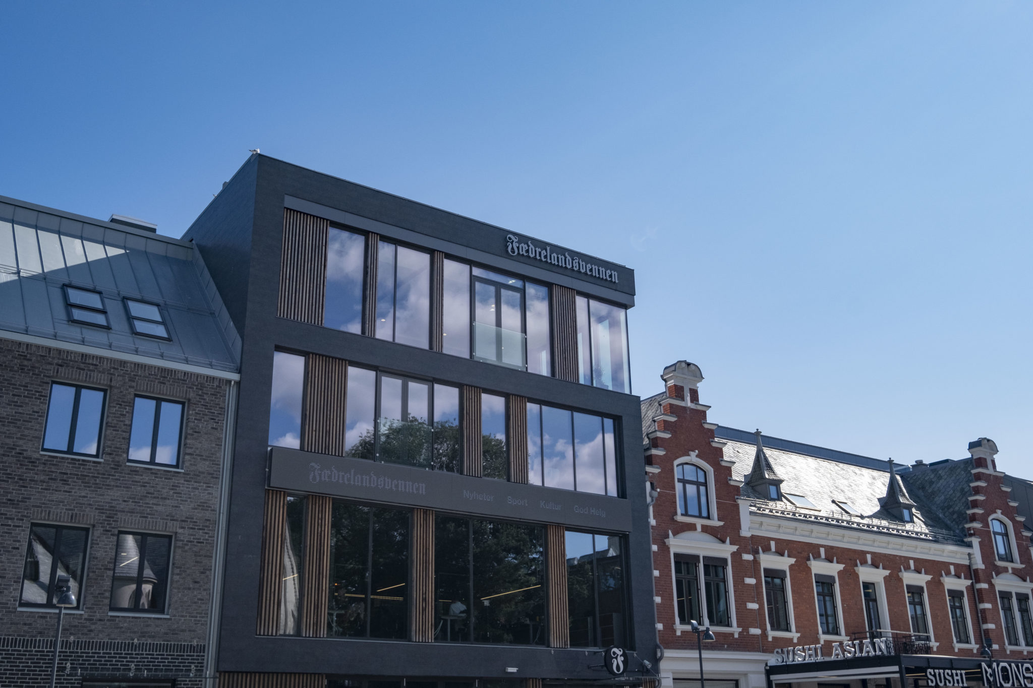 Fra fasaden til avisen Fædrelandsvennen på torvet i Kristiansand. Foto: Tor Erik Schrøder / NTB scanpix.