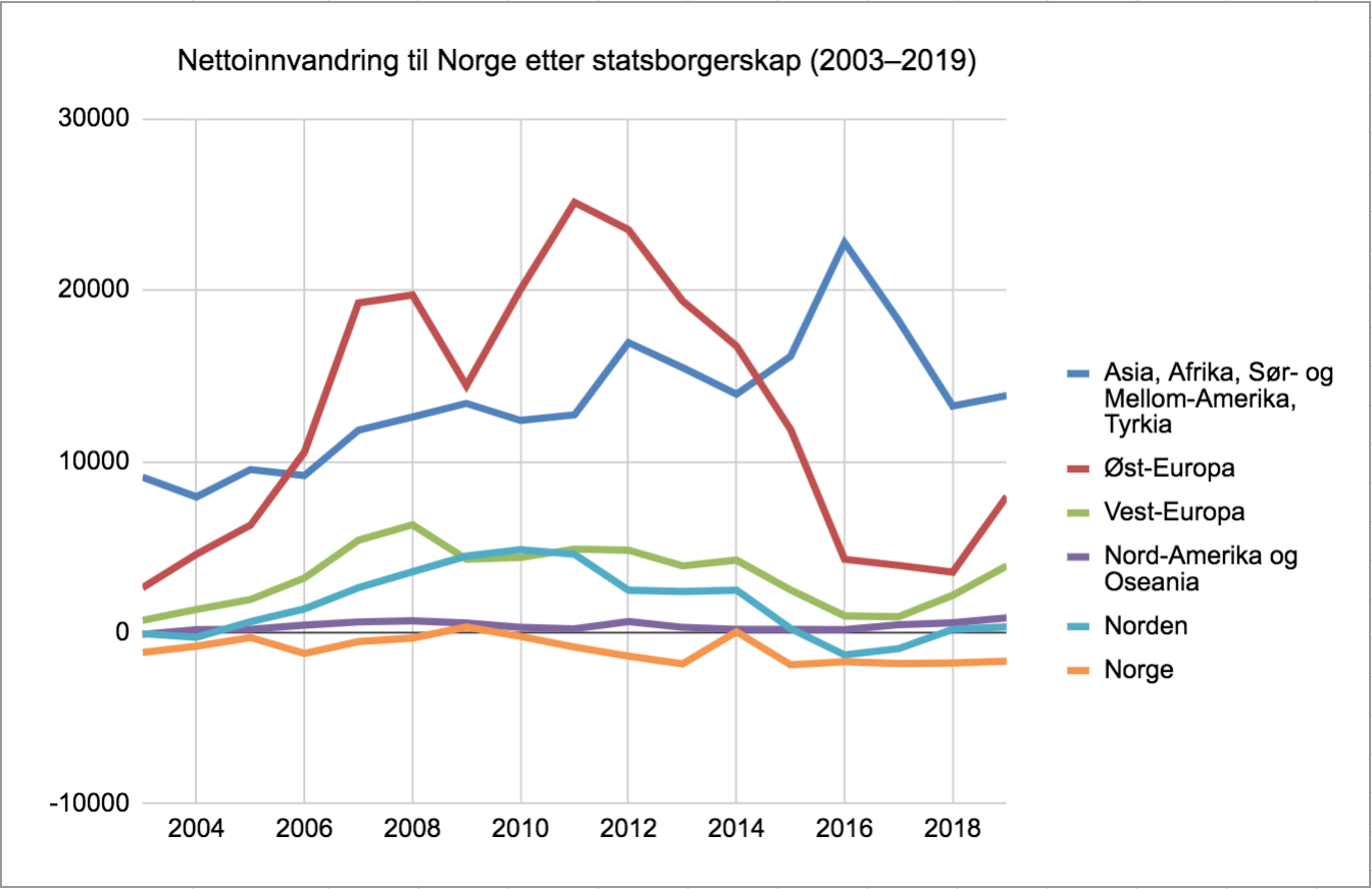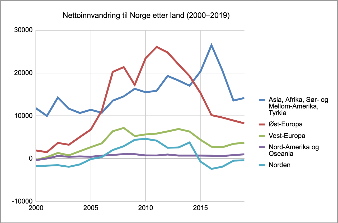 Den ikke-vestlige nettoinnvandringen til Norge i 2019 var på 13.843 personer. Antallet svarer omtrent til et fjerdedels fødselskull, og var høyere enn noen gang frem til 2011. Ikke-vestlig masseinnvandring har altså vedvart etter migrasjonsbølgen i 2015–16. Når tallene for 2020 etter alt å dømme går ned, vil det skyldes pandemien snarere enn innvandringspolitikken.
