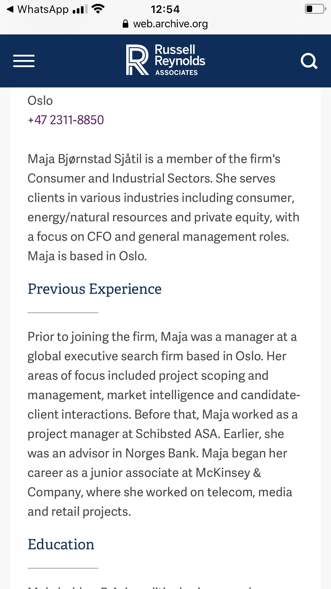 Russell Reynolds vet vi at kan ha såkalte Expats jobbende hos seg. Hvorvidt Maja Sjåtil jobber der i dag vites ikke, men det bør det spørres om og svares ærlig på.
