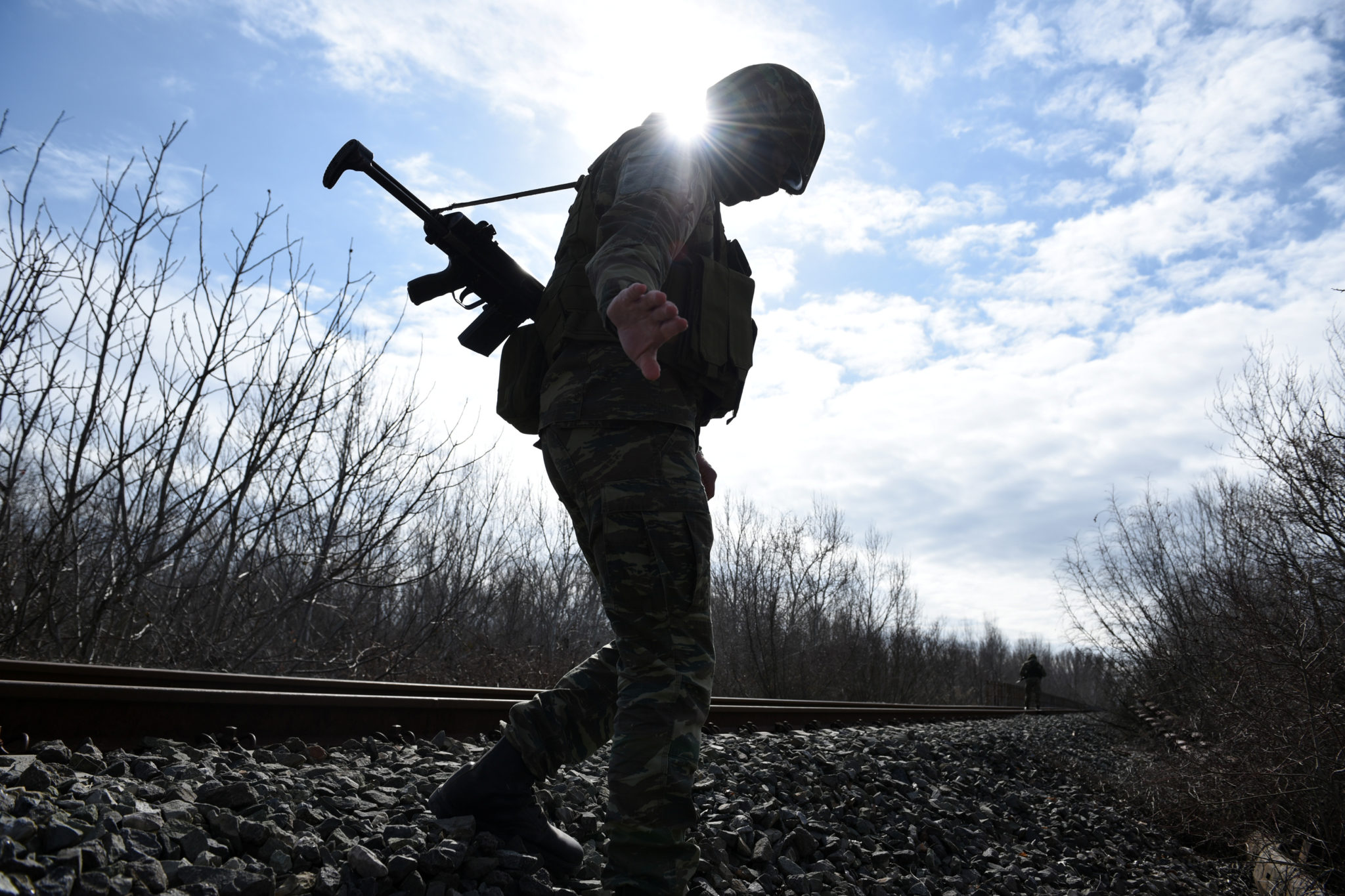 En grensesoldat går langs en jernbanelinje ikke langt fra Hellas’ grense mot Tyrkia ved elven Evros den 5. mars 2020. Foto: Alexandros Avramidis / Reuters / Scanpix.