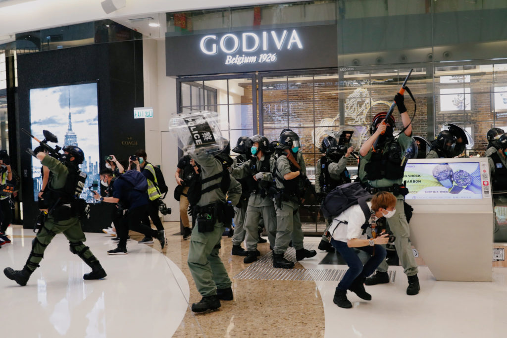 Politiet i Hong Kong bruker pepperspray på et kjøpesenter for å kontroll over opprøret. Foto: Reuters / Tyrone Siu / NTB Scanpix