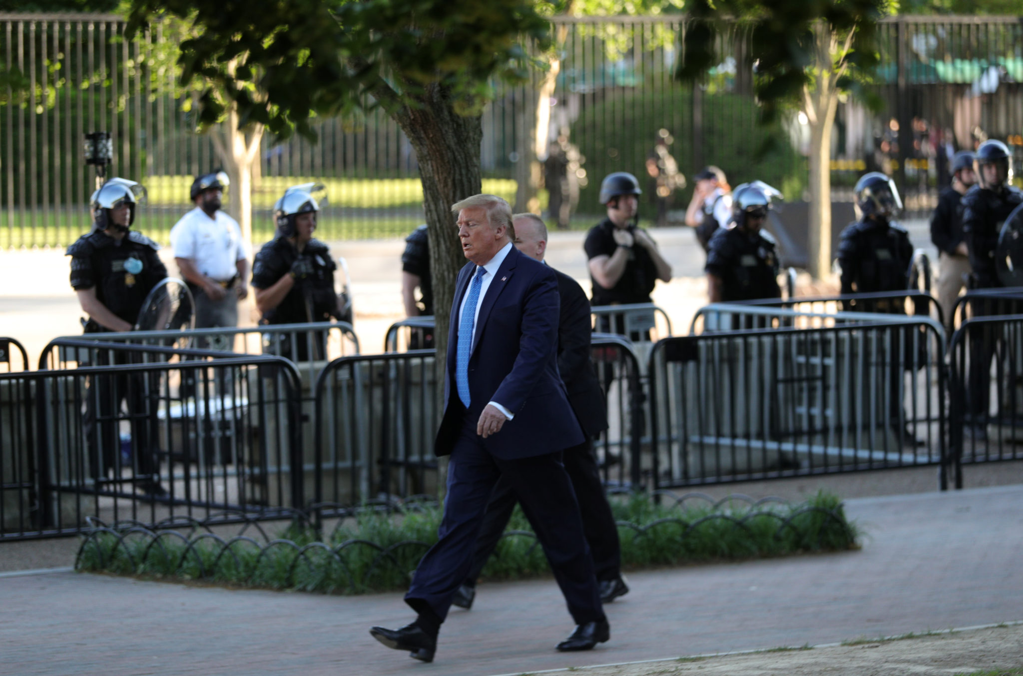 Trump går med faste skritt gjennom Lafayette-parken til St. Joseph-kirken. Han ble kritisert for å søke en fotomulighet. Det han virkelig gjorde var å vise de som vokter byen at han er deres leder og at han tør å gå ut. Det var en viktig manifestasjon. Dernest ville han markere hva han står for: Med Bibel i hånd utenfor kirken Antifa forsøkte å brenne ned. Heller ikke det liker kritikerne. Og prestene i den episkopale kirken er med på fordømmelsen. Det er uår. Foto: Tom Brenner/Reuters/Scanpix