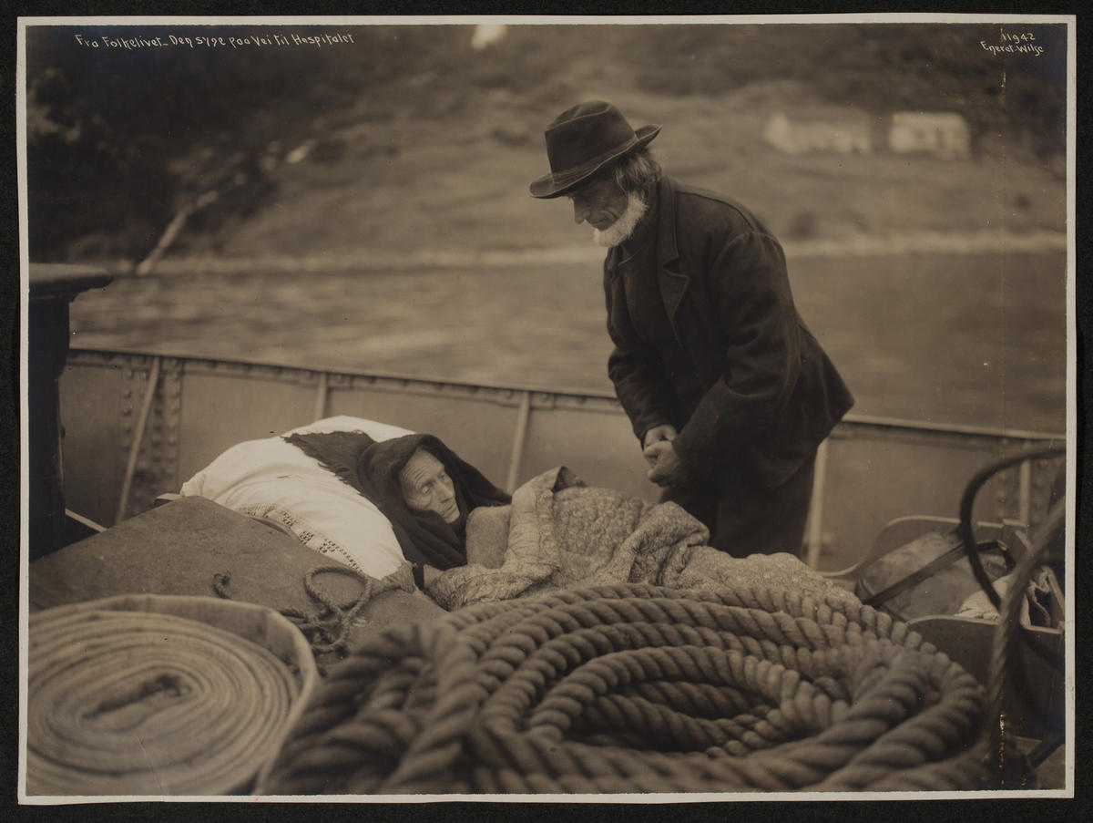 De avbildede er ekteparet Ingeborg og Ola Hustad på rutebåten fra Hjørundfjord til Ålesund en gang i 1910. Man kan av og til se at bildet er forsynt med titelen Siste reis – men i dette tilfellet stemmer det ikke. Deres barnebarnsbarn Kjell Henry Hustad (f. 1943) opplyser at hans oldemor ble frisk igjen, og gikk bort først fire år senere.