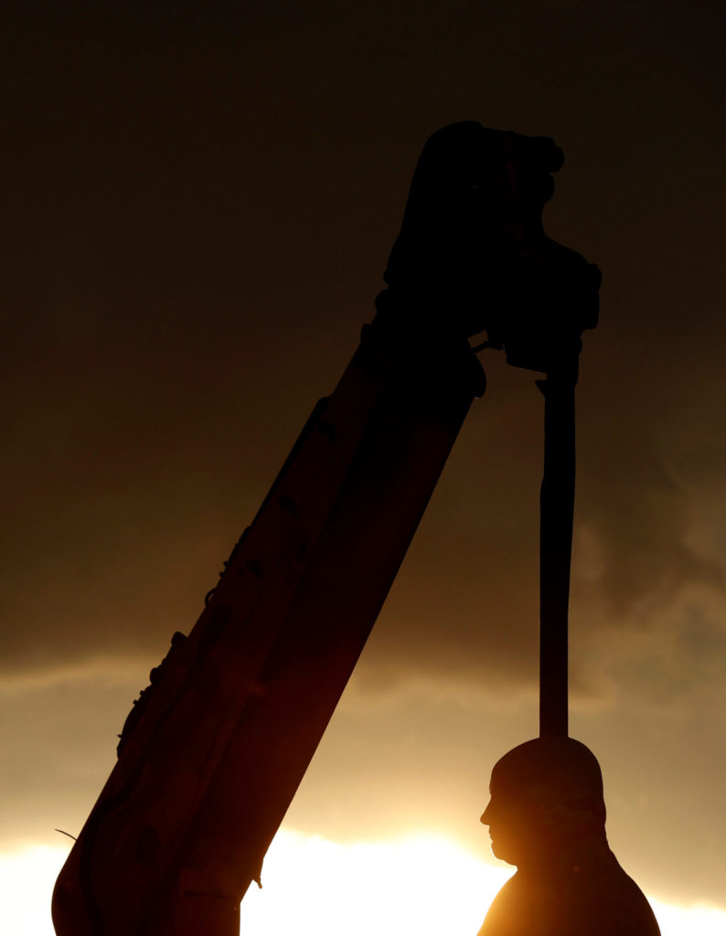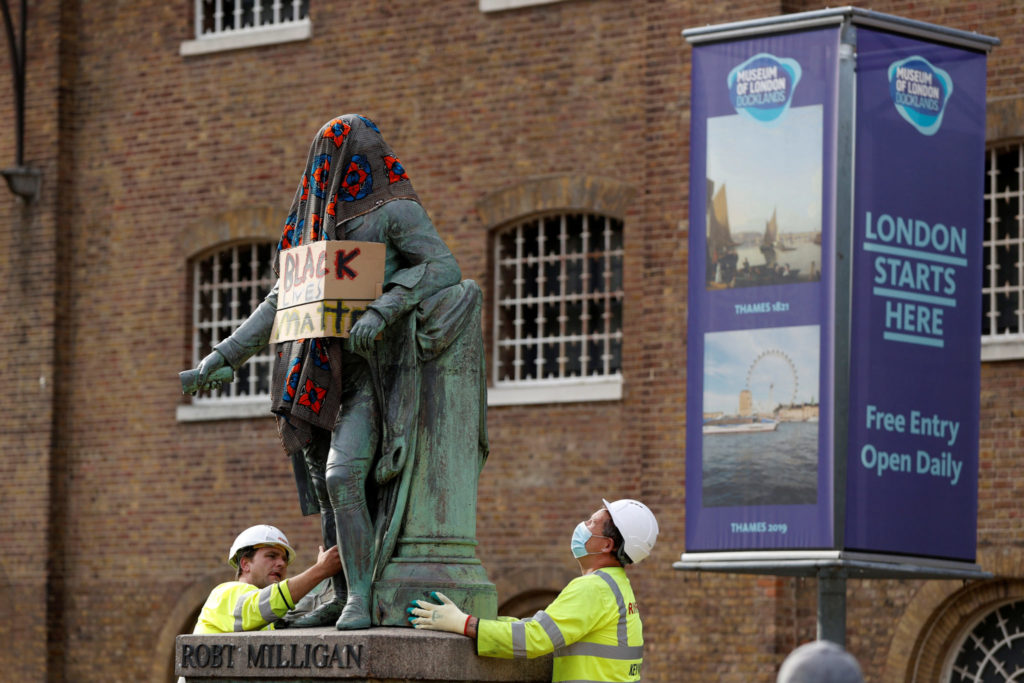 En statue av den berømte handelsmannen og skipsrederen Robert Milligan ble tirsdag fjernet av myndighetene i London – med en løftekran.
