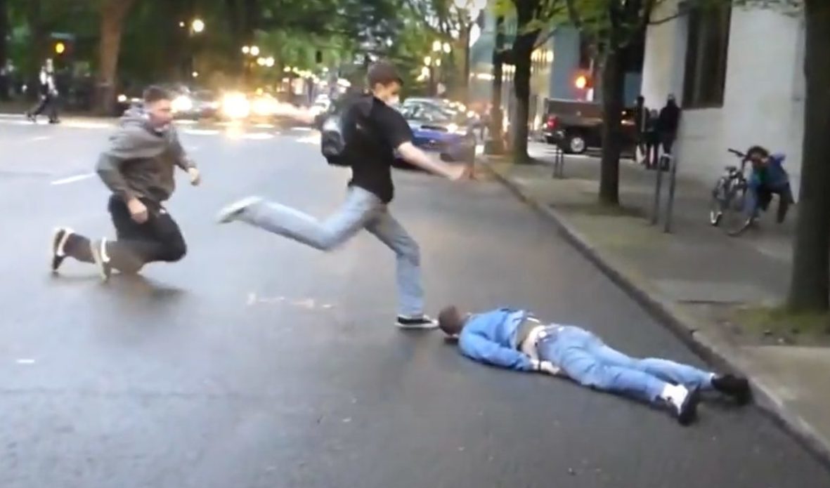 Mannen blir slått ned, han ligger livløs på bakken når han blir sparket med full kraft i ansiktet. En kvinne roper: – Black Lives Matter, din homo!