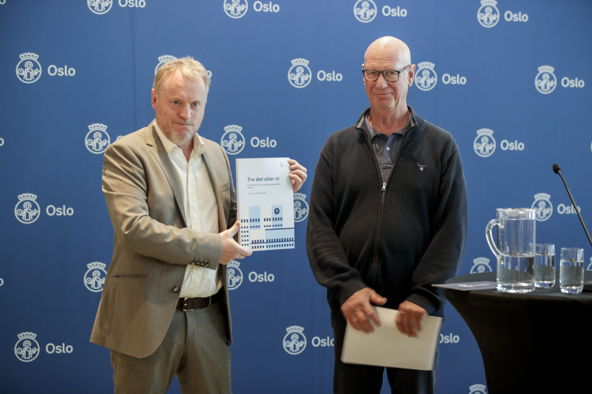 Utvalgsleder Trond Bakkevig presenterer og overleverer rapporten «Tro det eller ei. Fremtidens tros- og livssynspolitikk i Oslo fra tros- og livssynsutvalget» til byrådsleder Raymond Johansen (Ap) t.v. 28. mai i Lørenskog. Foto: Vidar Ruud / NTB